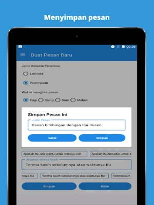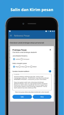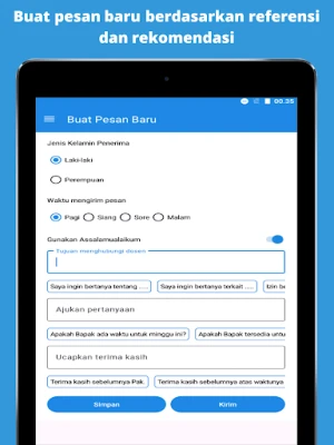 Etika Cara Chat Dosen dibekali dengan koleksi referensi pesan yang komprehensif, mencakup beragam skenario umum, mulai dari permohonan izin tidak masuk kuliah, pengajuan bimbingan skripsi, hingga pertanyaan seputar perkuliahan. Anda tidak perlu lagi menebak-nebak kata yang tepat; cukup pilih template yang paling sesuai. Yang lebih hebat lagi, aplikasi ini memungkinkan personalisasi mendalam pada setiap template. Sesuaikan nuansa, detail, dan konteks pesan agar benar-benar merefleksikan situasi pribadi Anda, menjadikannya unik dan relevan. Setelah pesan tersusun sempurna, Anda dapat dengan mudah menyimpannya di Etika Cara Chat Dosen untuk penggunaan berulang di kemudian hari, menghemat waktu dan memastikan konsistensi dalam komunikasi Anda.